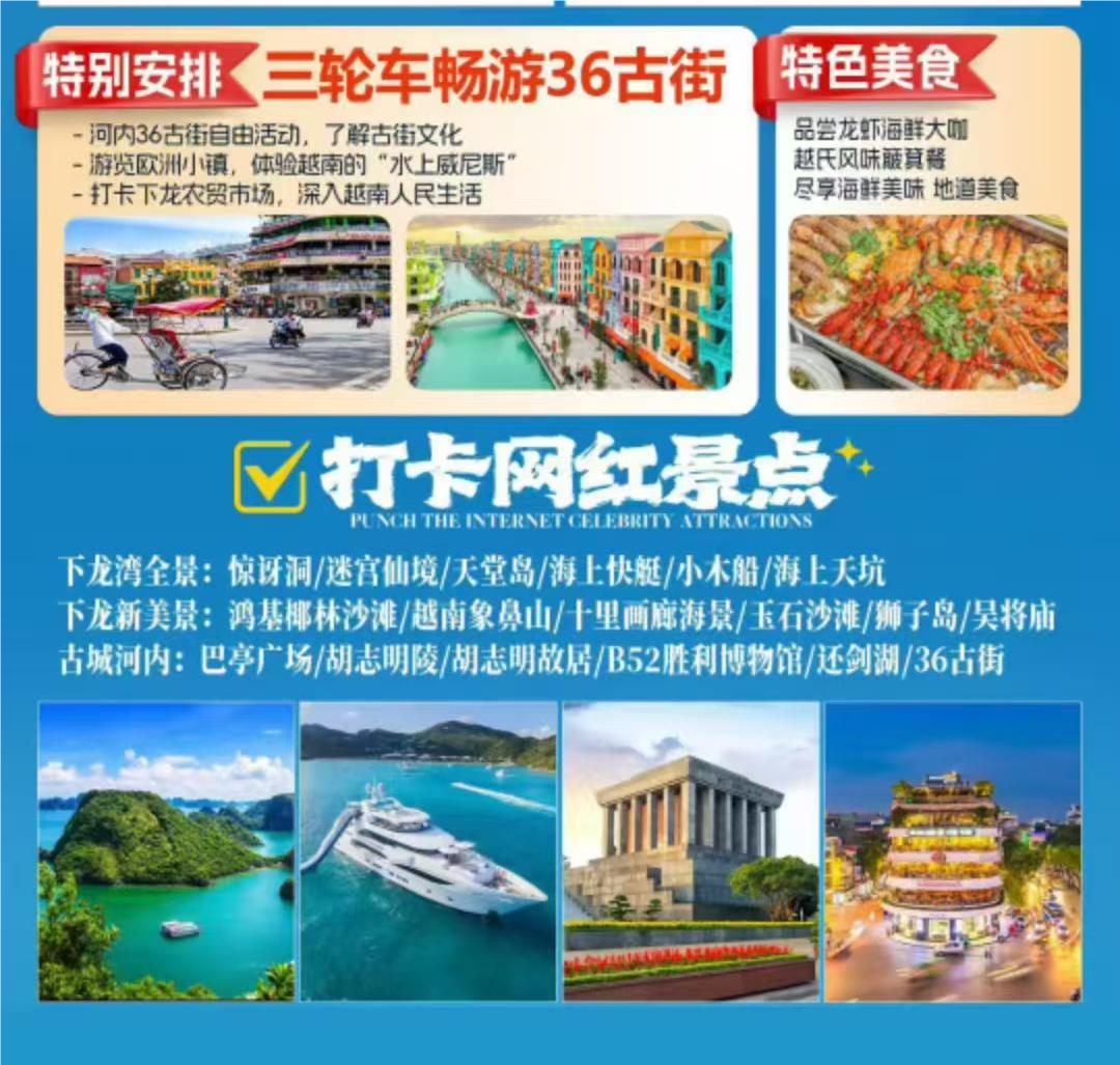 特別安排乘坐【河內(nèi)特色三輪車】深入了解古街文化;河內(nèi)36古街,坐落于河內(nèi)名景還劍湖西部和北部,是由縱橫交錯的三十六條狹窄的街道組合而成,這里有傳統(tǒng)的越南建筑門店,也有法國風格的大教堂,更有結合了法國與越南風味的美食與咖啡文化,隨處都是令人垂涎的街頭小吃,比如越南河粉、饅頭、Cha(河內(nèi)風格的烤魚)、Banh goi、法式面包、烤肉粉、越南果汁等等。漫步在熙攘的街道上,品嘗地道美食,感受法國文化與越南風情的完美結合。打卡【河內(nèi)大教堂 又名:圣約瑟夫大教堂】,是客人最具代表性的法式建筑,始建于1886年,是河內(nèi)最古老的教堂。可自由打卡網(wǎng)紅【火車街】,后乘車返回下龍,入住酒店休息。
