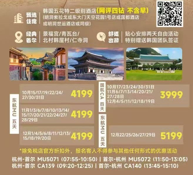 D-1 | 杭州-首爾仁川 參考航班: MU5071(08:05北京時間-11:15韓國時間)/ CA139(09:20北京時間-12:25韓國時間) | ||