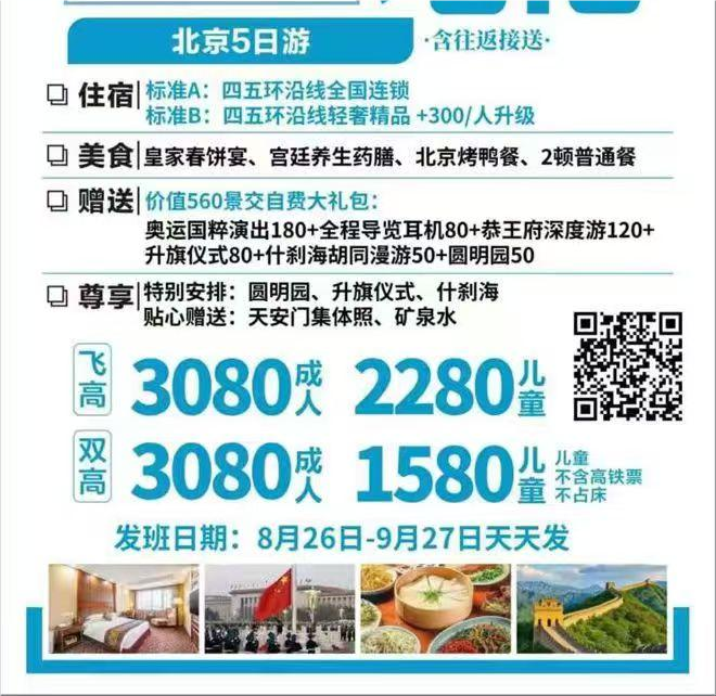 早餐打包,前往天安門廣場觀看大國禮儀神圣典禮【升國旗儀式】(如預(yù)約不上升旗則改為降旗,旅行社不承擔(dān)任何責(zé)任),游覽【毛主席紀(jì)念堂】瞻仰毛主席儀容(若遇政府關(guān)閉或限制團隊流量預(yù)約不上則改為參觀外景,旅行社不負(fù)任何責(zé)任),游世界現(xiàn)存最大的古代宮殿建筑群【故宮博物院深度游】(首道門票,不少于2小時),身處紅墻黃瓦,金碧輝煌的殿宇樓臺中,穿越時光年輪追溯那鼎盛的康乾盛世,眼前浮現(xiàn)歷史的滾滾煙幕。 中餐安排特色【北京京味菜】特別安排品嘗北京烤鴨體驗老北京的美食;后參觀【什剎海胡同漫游】(不少于45分鐘。)什剎海指前海、后海、西海三個湖泊及鄰近地區(qū),這里擁有大片優(yōu)美的湖面,也是北京著名的一片歷史街區(qū),眾多名人故居,王府等古跡散落其中,還有貼近老百姓生活的各種美食,后海酒吧街更是京城夜生活的老牌勝地。 游覽明清兩朝歷代皇帝祭天之地【天壇公園】是世界文化遺產(chǎn),明清兩代二十四位帝王舉行登基大典及祭祀天神的專用祭壇,也是世界上現(xiàn)存規(guī)模最大,最完美的古代祭天建筑群。(首道門票,不少于1小時),后觀北京【國粹表演】——京城第一秀(與海內(nèi)外上千名游客共同欣賞為北京奧運特創(chuàng)編排,節(jié)目精彩絕倫,觀看1小時);晚餐后入住酒店休息; ☆溫馨提示:1、當(dāng)天行程景點位于北京古老中軸線上,全天以步行為主。加之此中心區(qū)域為國家重要職能部門所在地,交通管制嚴(yán)格明確,單行道內(nèi)不可隨意停車。故在此區(qū)域候車時間較長,步行路程較多,敬請?zhí)崆白龊眯睦頊?zhǔn)備,謝謝配合及理解。